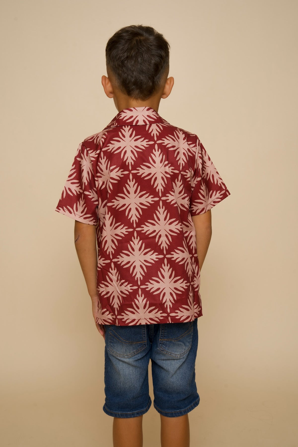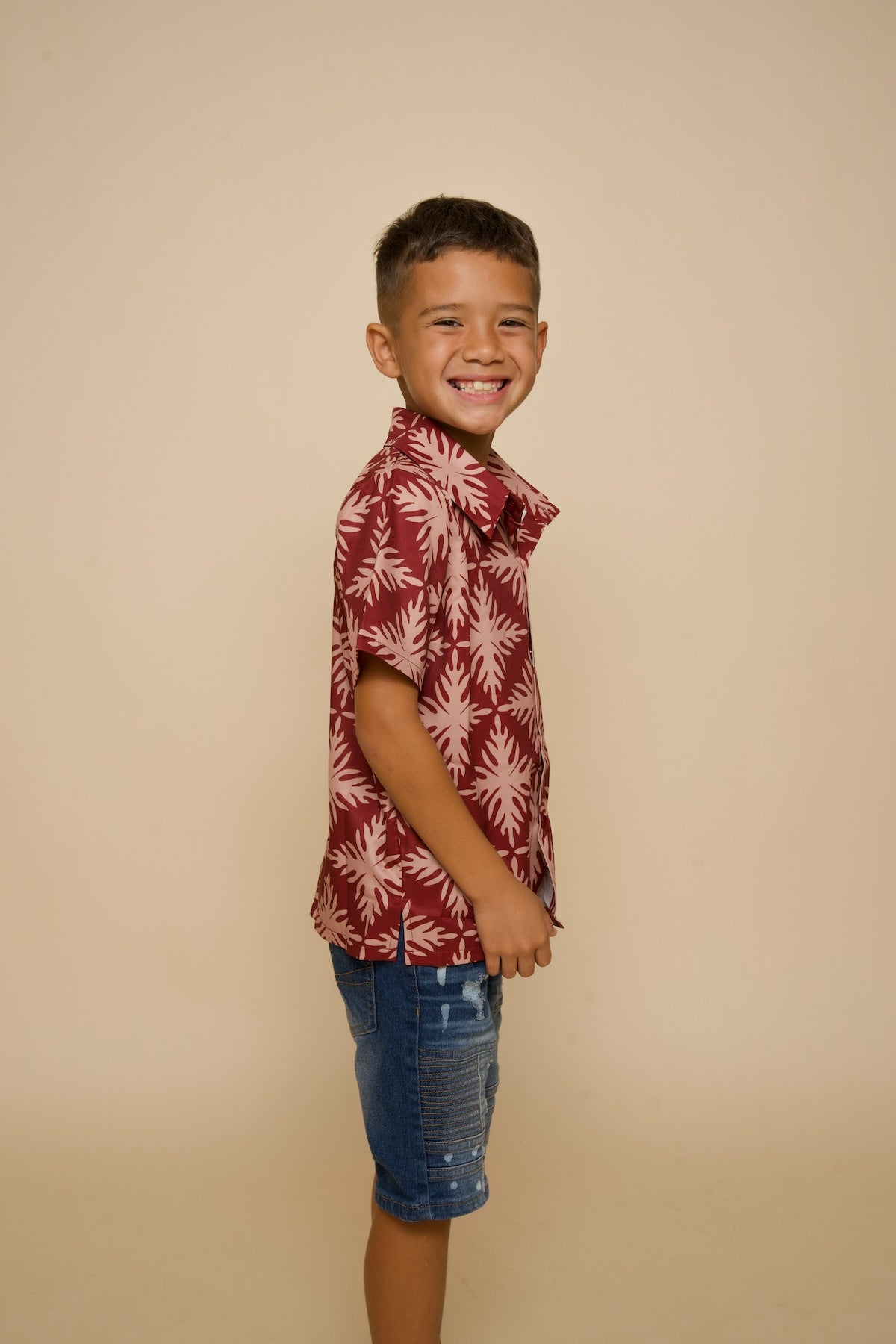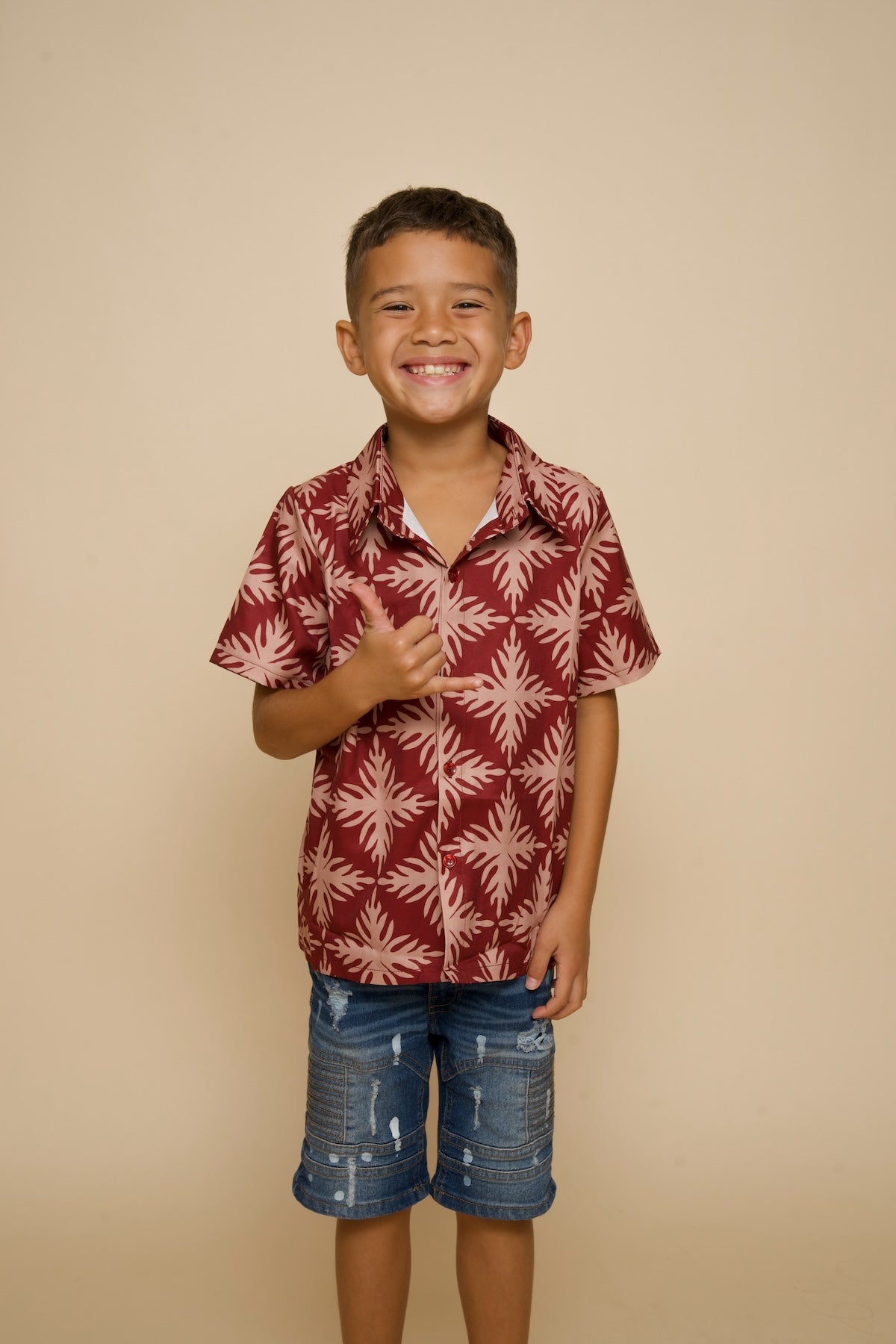 The Keaka Keiki Boys Aloha Shirt is a light, comfortable material! Part of our Ohana Matching Apparel in Kona Quilt Green, Red, and Nude!
