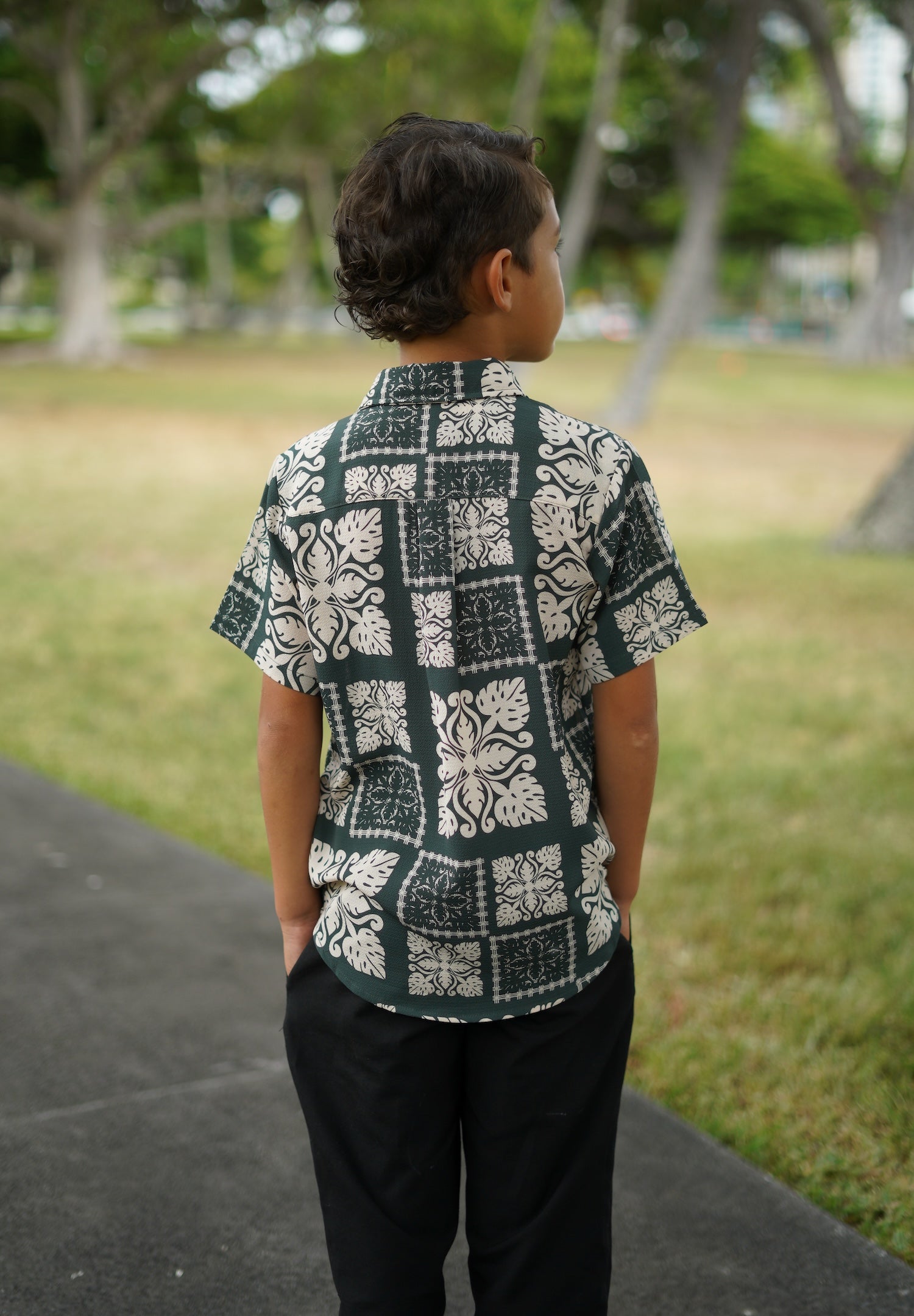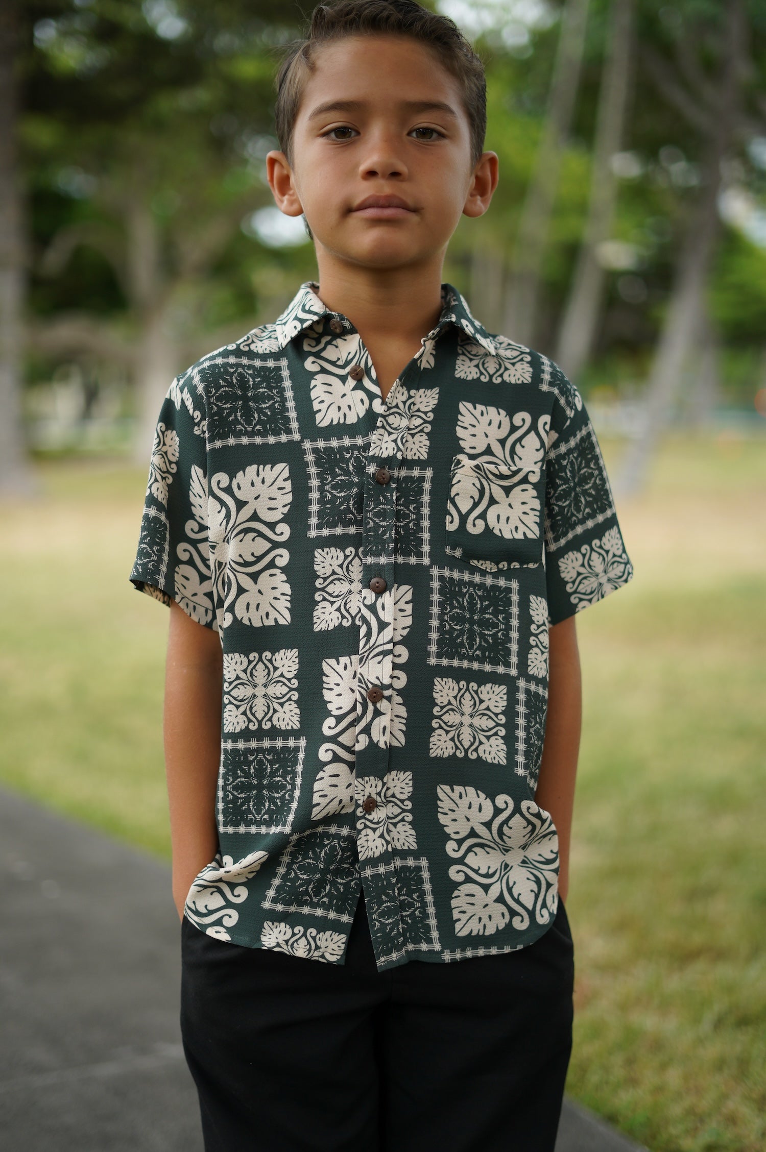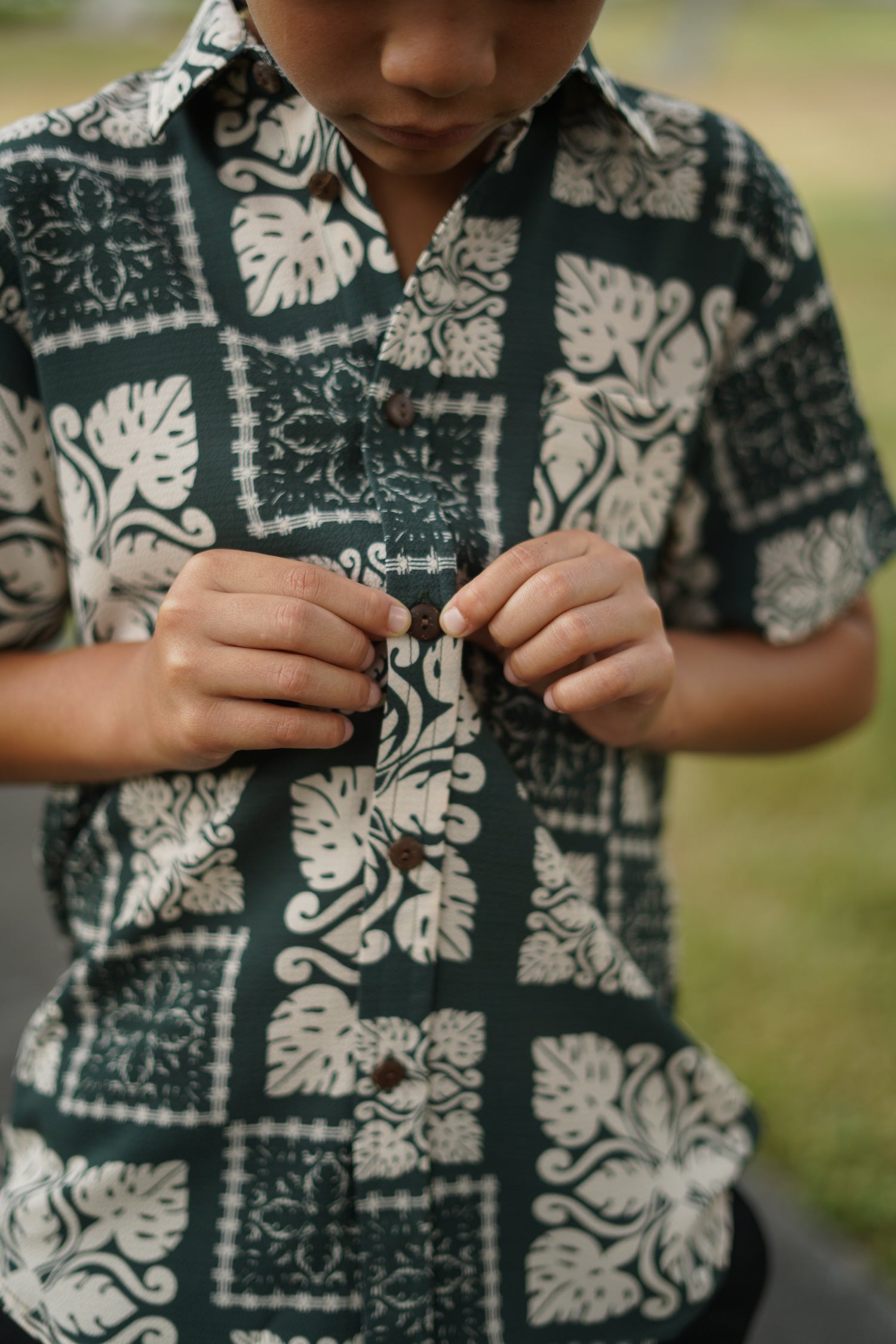 The Ahe Keiki Boy Aloha Shirt is part of our Country Quilt Emerald matching apparel collection!