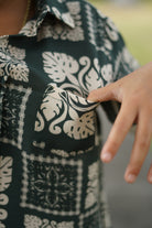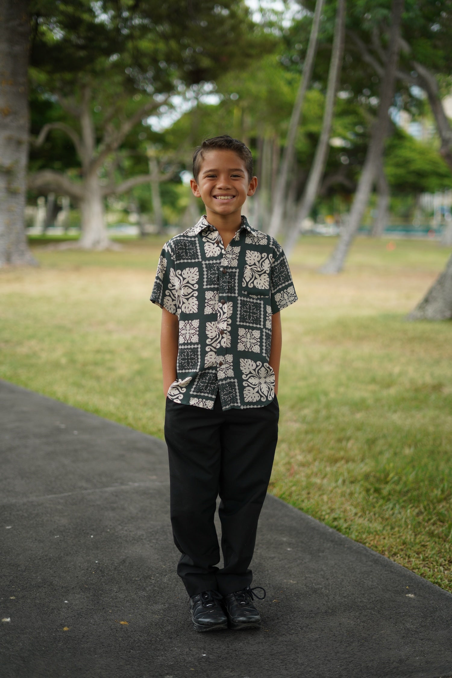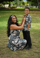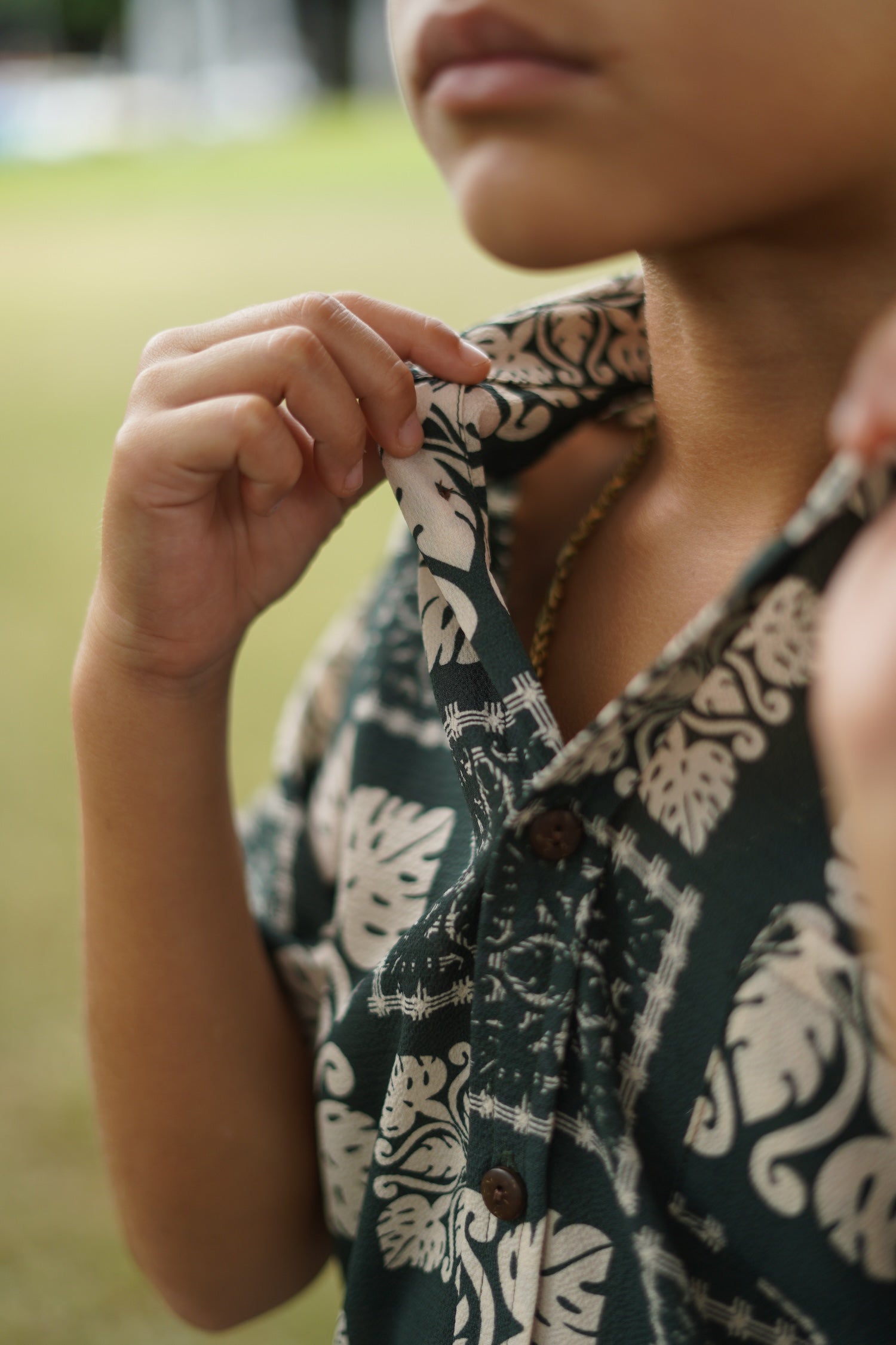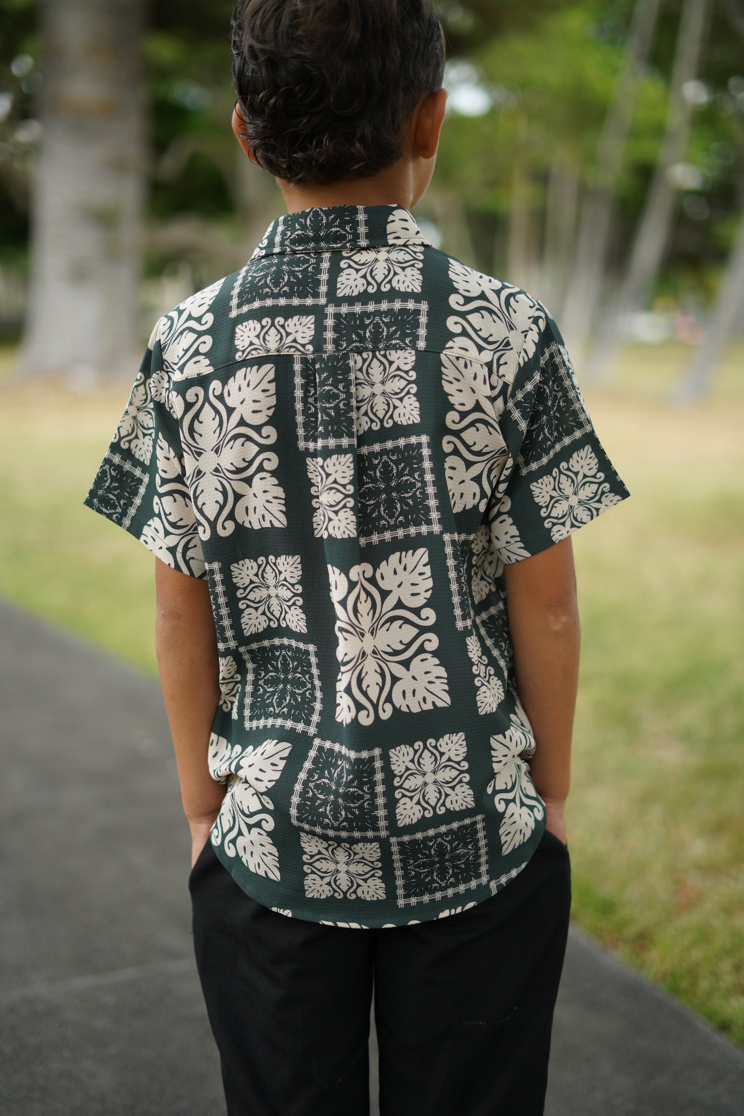 The Ahe Keiki Boy Aloha Shirt is part of our Country Quilt Emerald matching apparel collection!