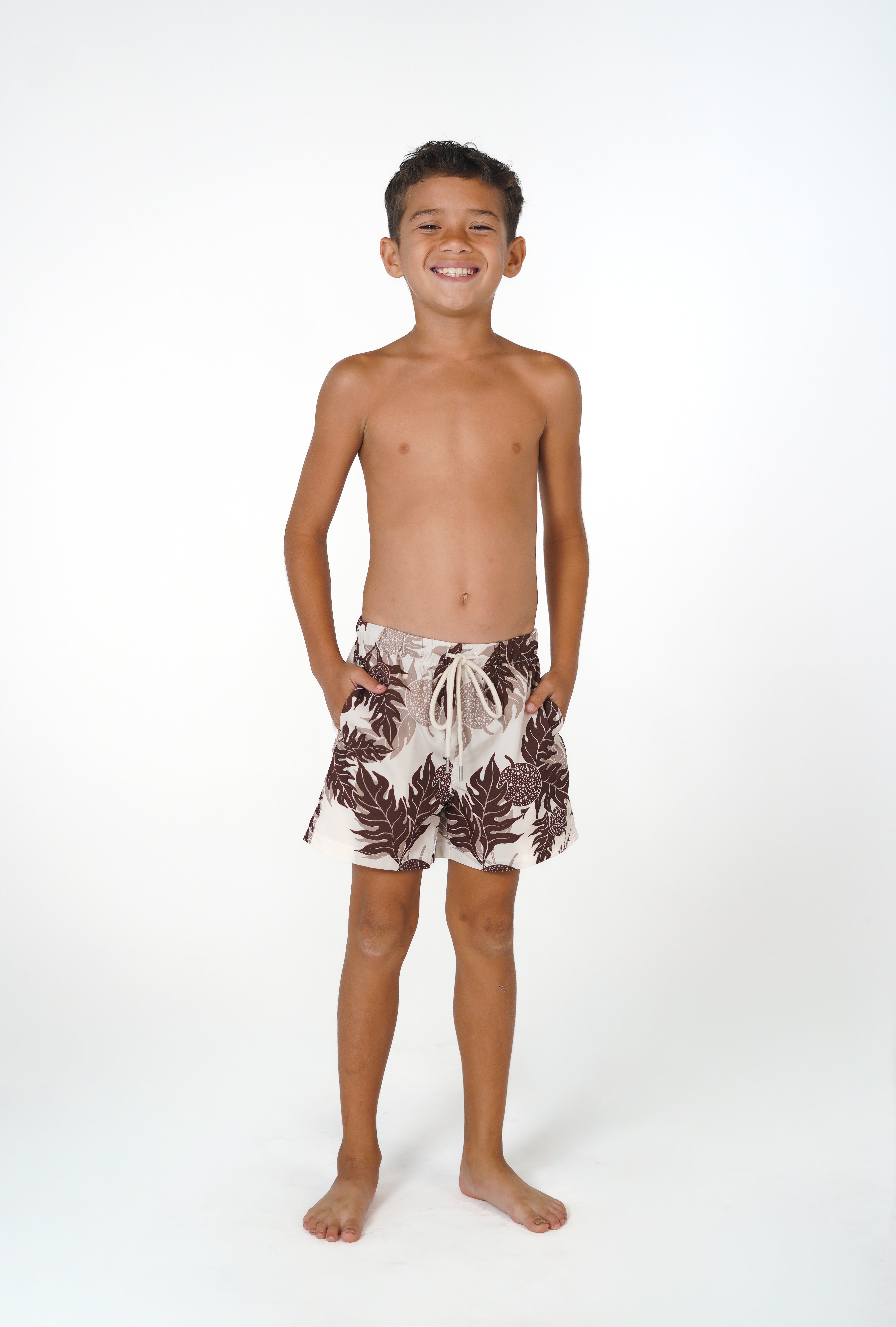 Match your keiki! Our Ohana Matching Swim collection includes these adorable keiki boys swim shorts. Shop in the new Ka Ulu Cream print.