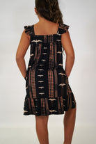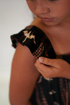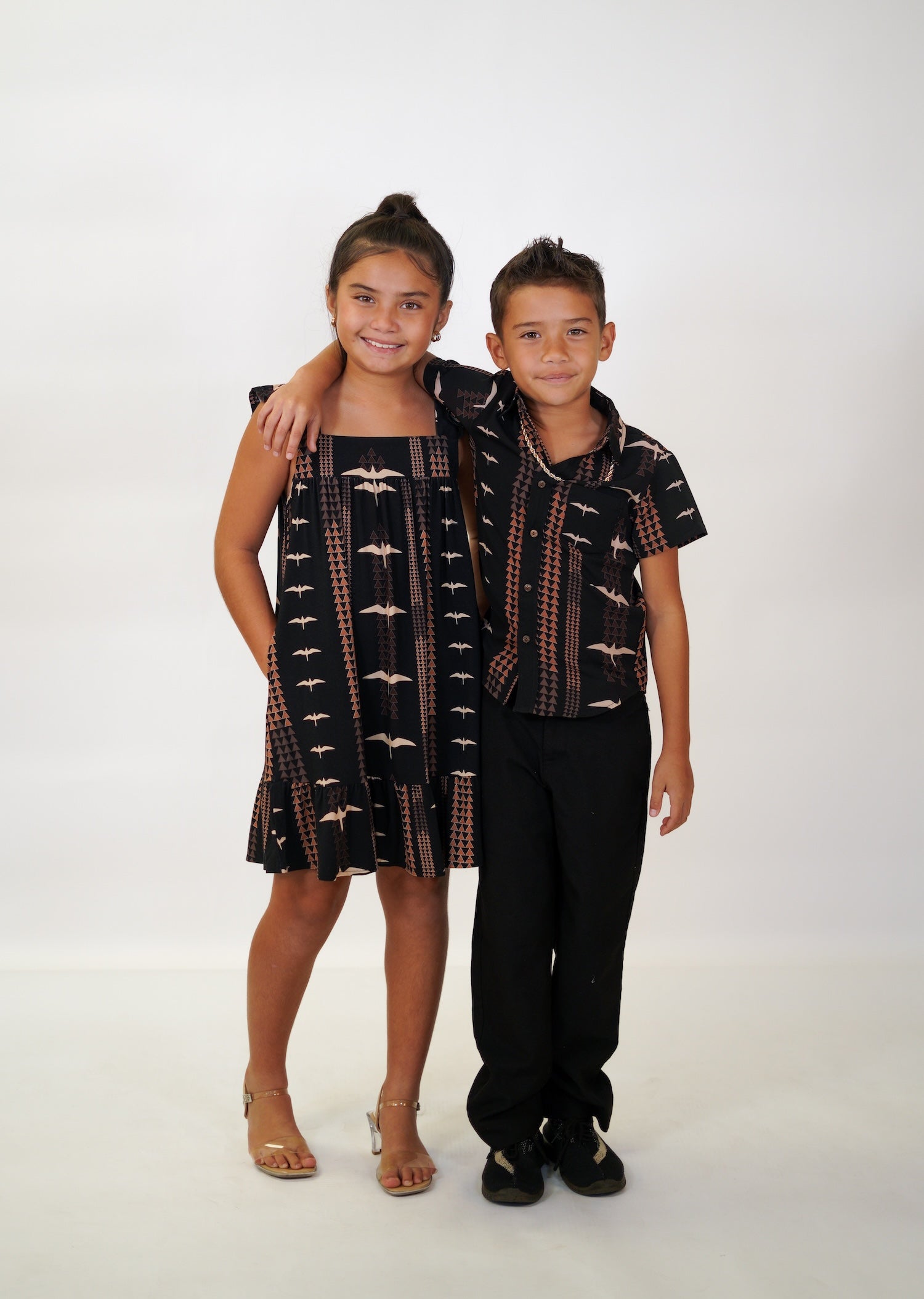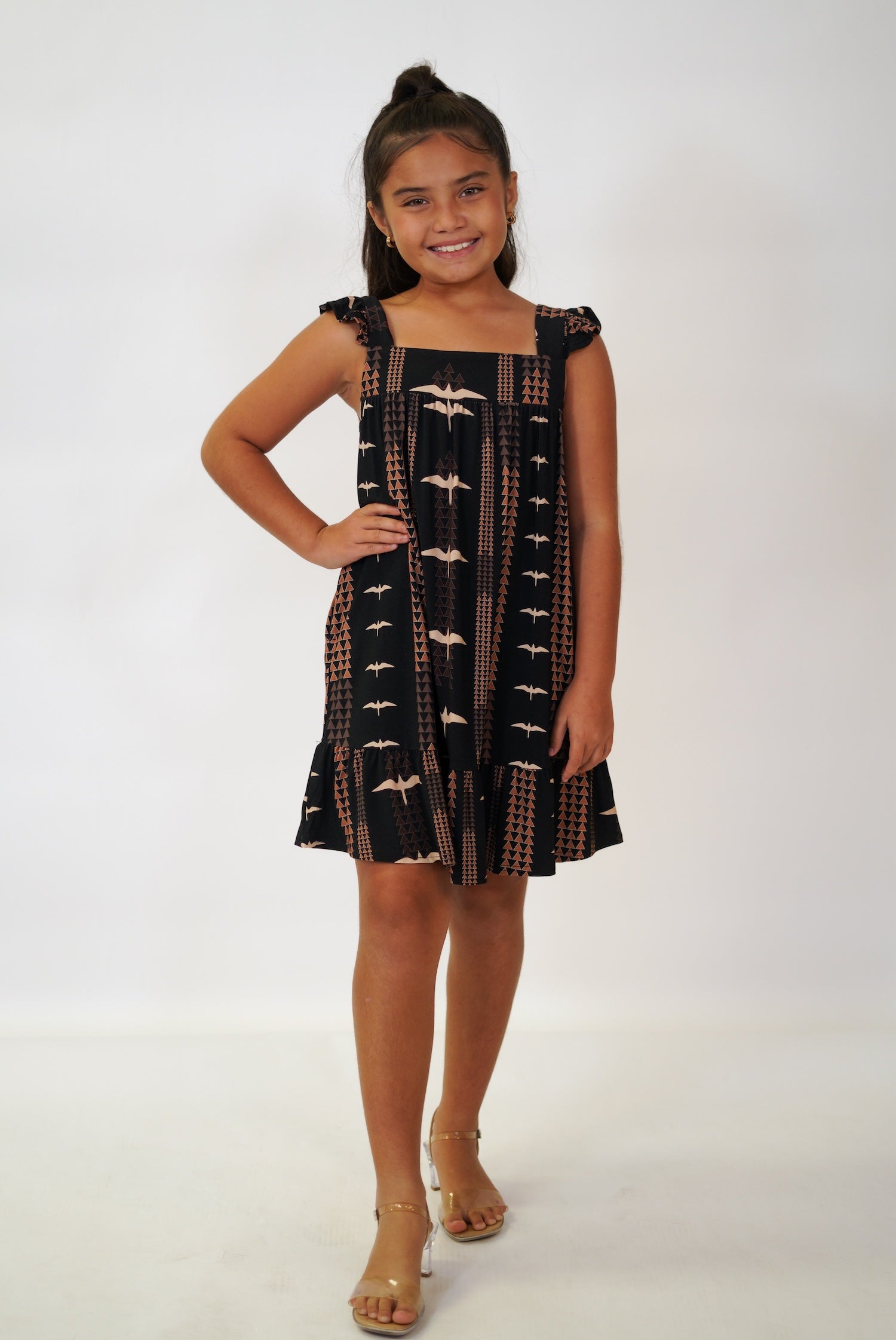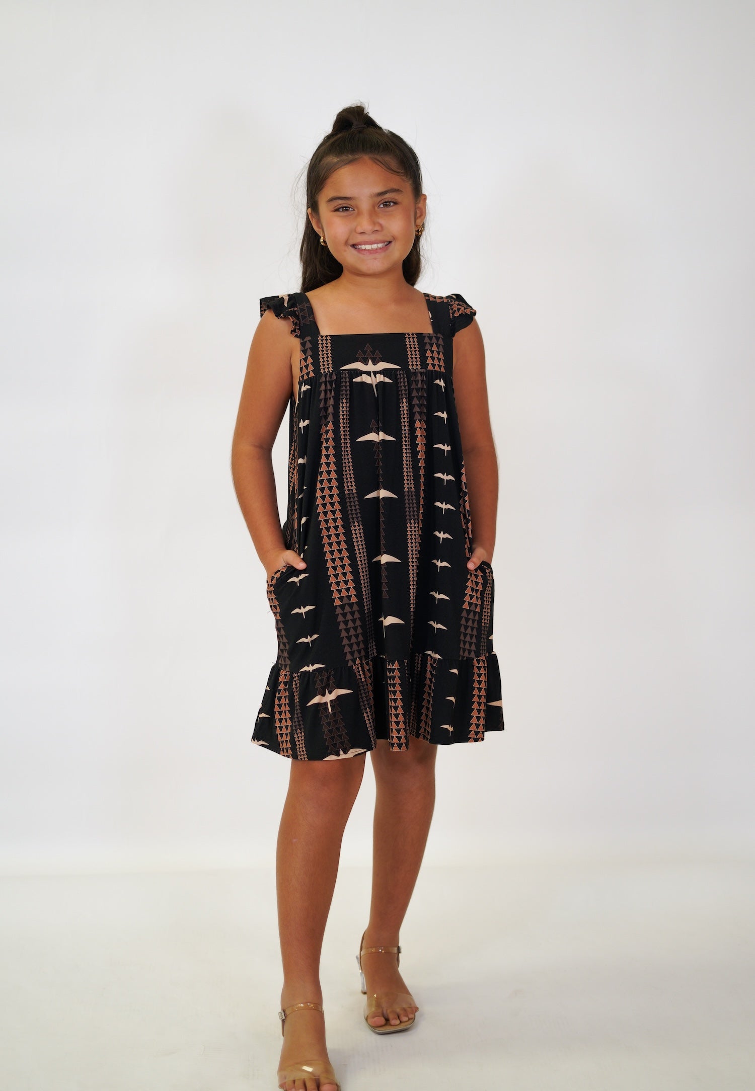 The Paisley Keiki Girl Dress is part of our Lōkahi Black Matching Apparel Collection! Soft and stretchy bamboo cotton , ruffle sleeves and trim, pockets.