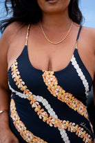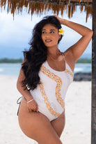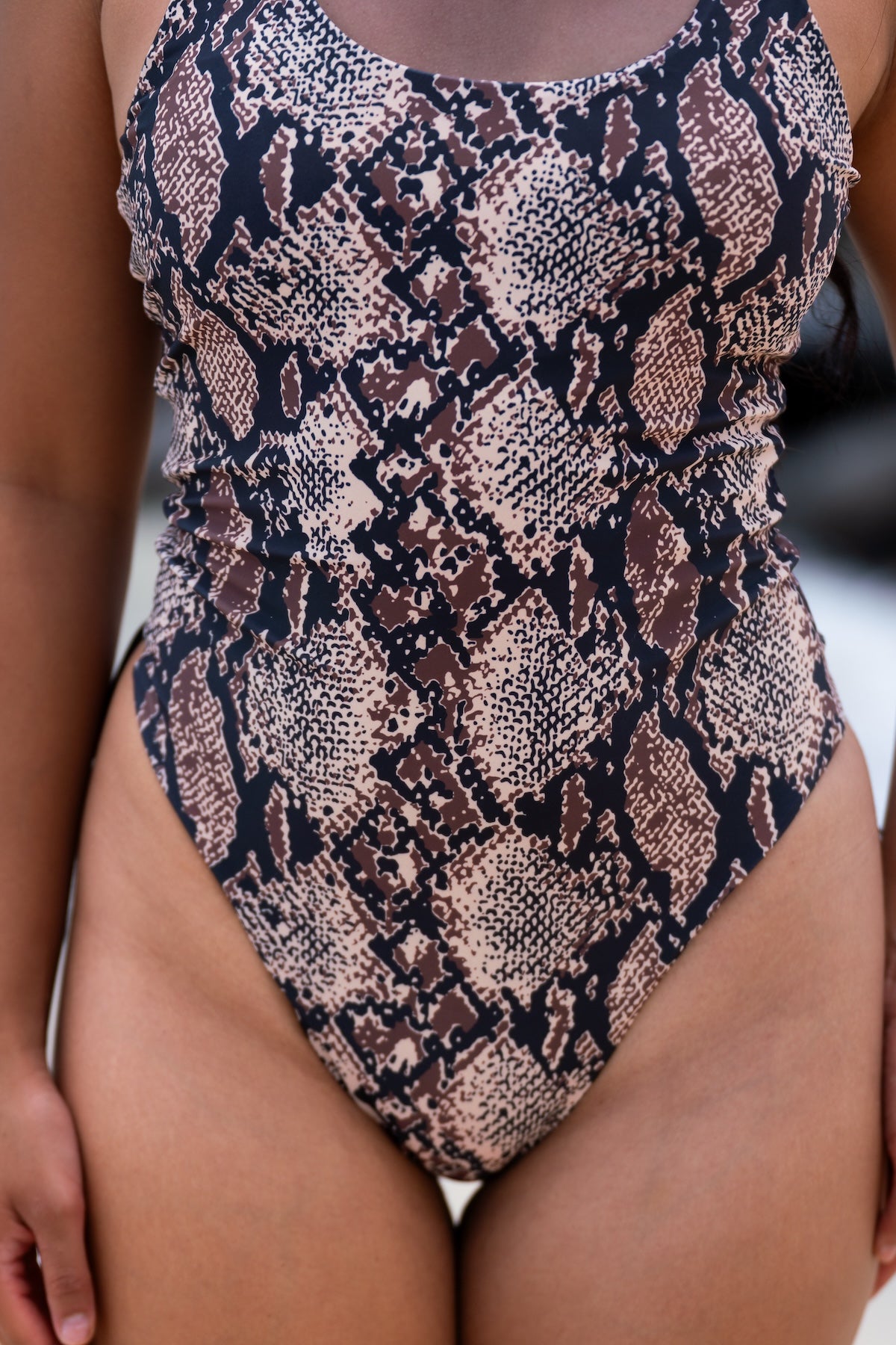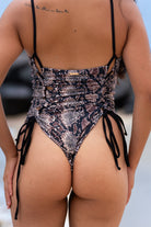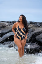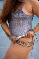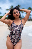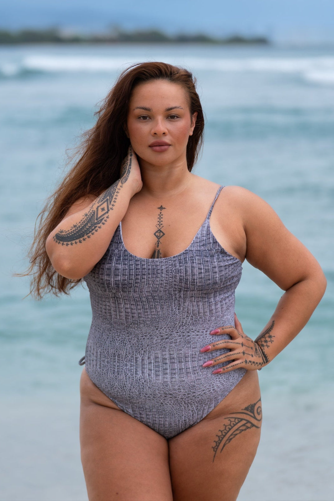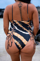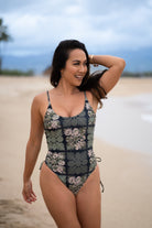 Looking for a reversible one piece with just the perfect amount of sexy? Look no further! The laced up detail on this bikini is subtle and can be adjusted to your preference of coverage. Now available in the following 5 prints: Alligator, Puakenikeni Pikake Black/Nude, Snake Skin/Cheetah, Hebrew Shell Black/Jade, and Ulu Army Black/White!